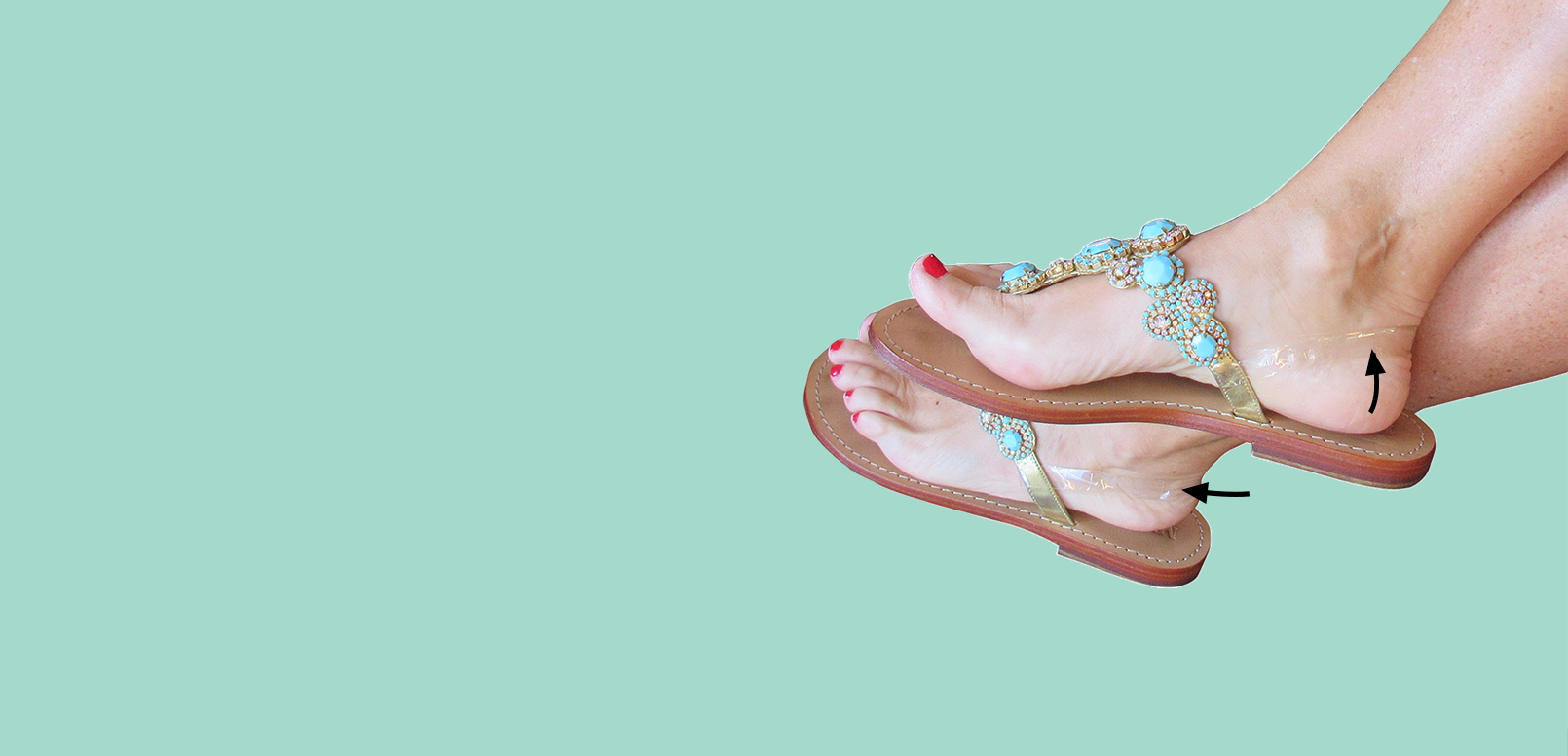 Wrap the transparent strap around the back of your ankle, secure both ends around your sandal straps. Voilà! It’s that easy! Clear Sandal Straps!